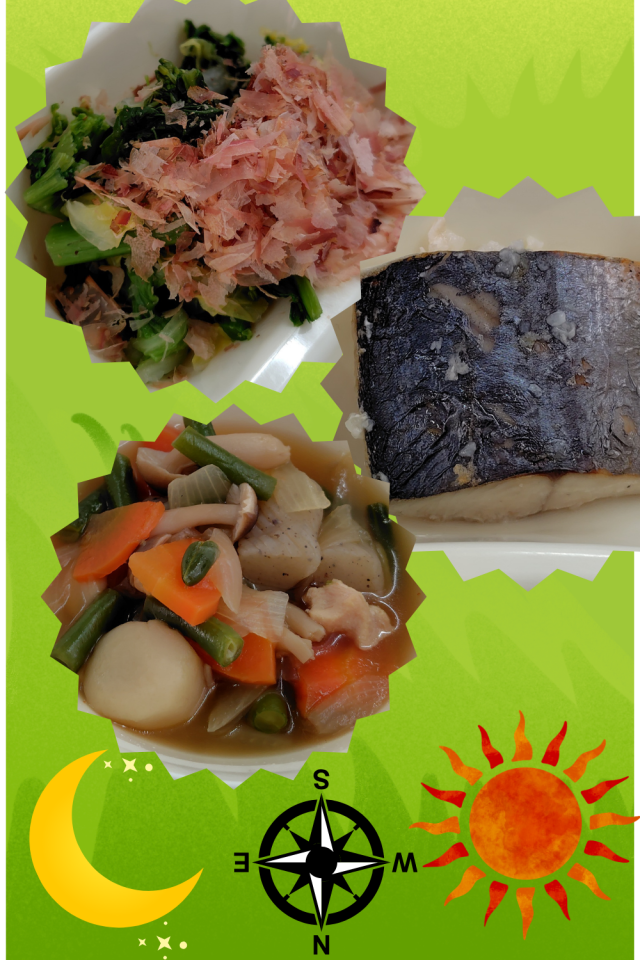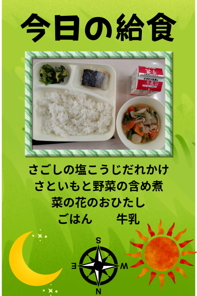 本日の給食のメニューは、さごしの塩こうじだれかけ、さといもと野菜の含め煮、菜の花のおひたし、ごはん、牛乳でした。