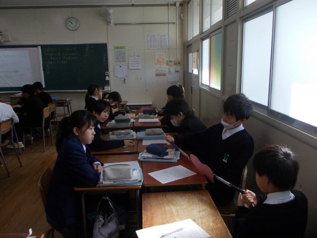 3限目は、1年生の理科の授業。単元は、「力のつり合い」でした。実演も交えながら、班での学習を行いました。ICTも活用し、丁寧な説明がなされていました。一所懸命に学習に取り組む姿が見られました。がんばっています、79期生!