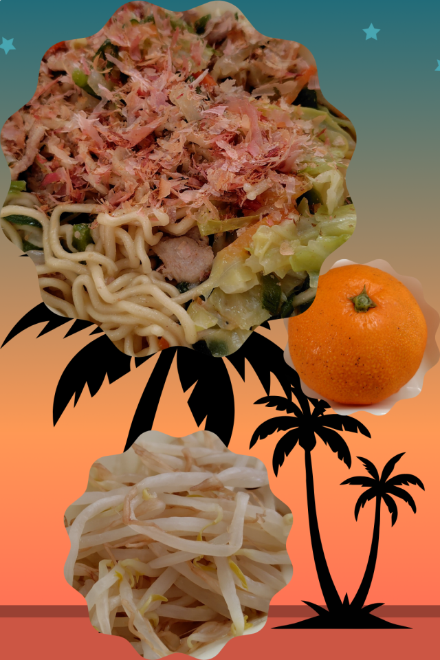 本日の給食は、和風焼きそば、もやしのしょうがづけ、みかん、ミニコッペパン、牛乳でした。