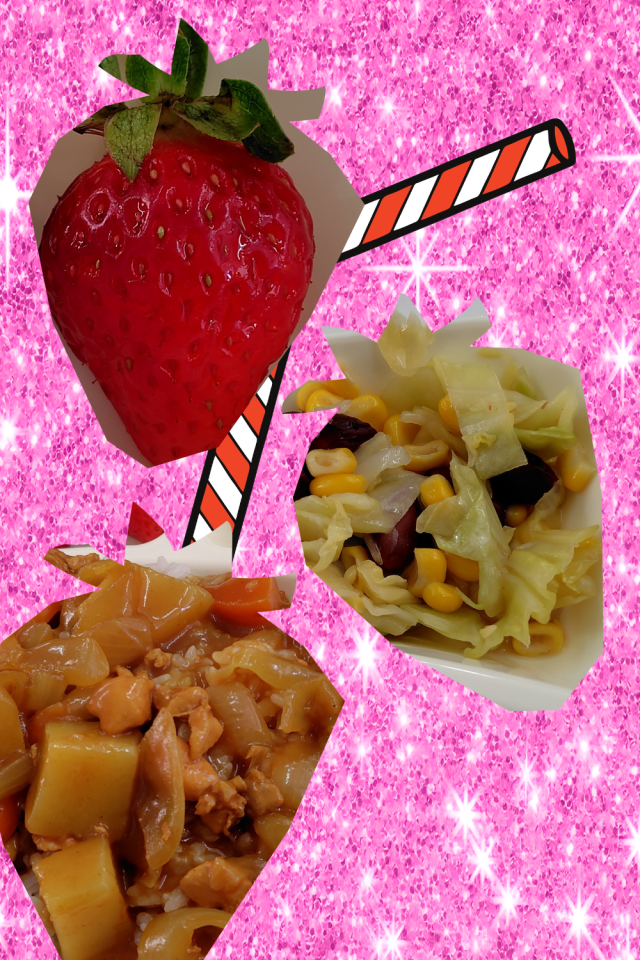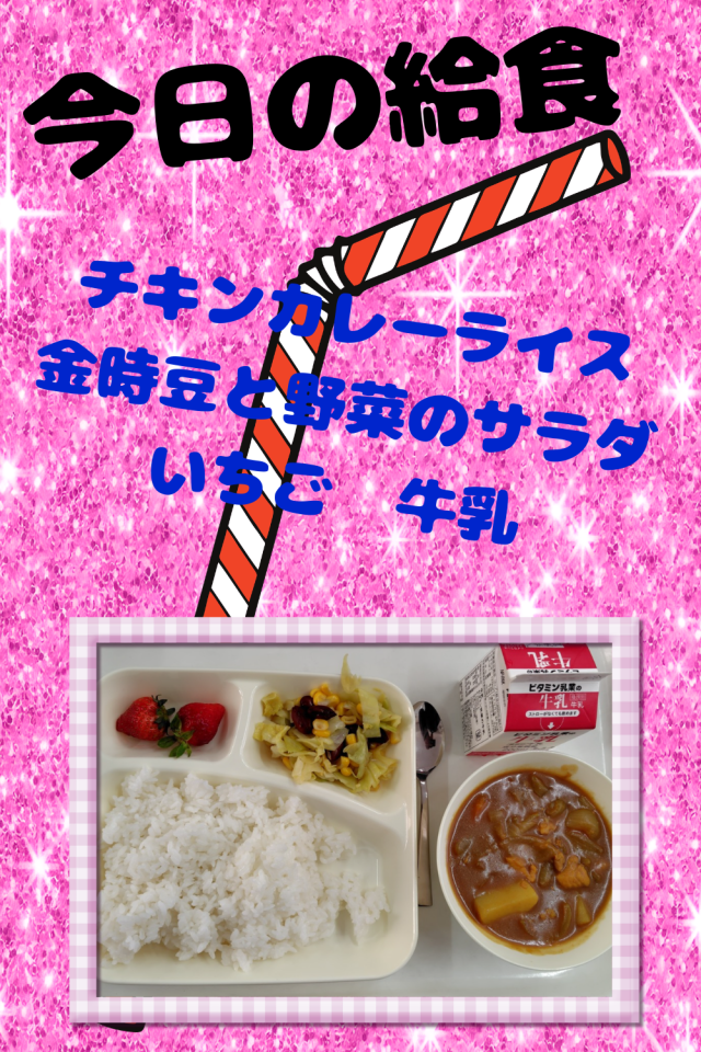 本日の給食のメニューは、チキンカレーライス、金時豆と野菜のサラダ、いちご、牛乳でした。