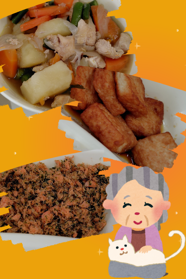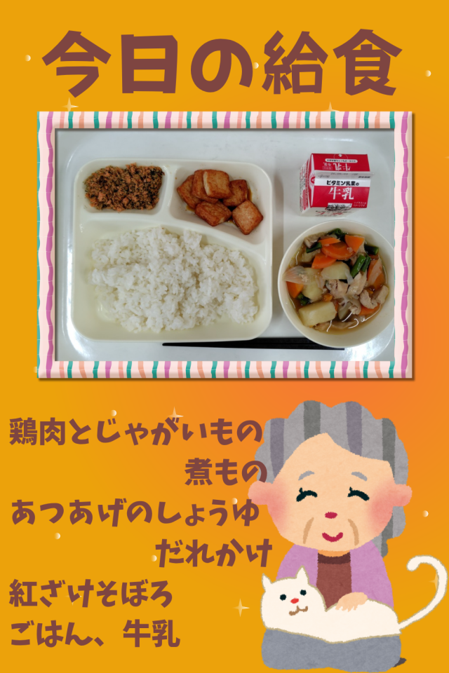今日の給食は、鶏肉とじゃがいもの煮もの、あつあげのしょうゆだれかけ、紅ざけそぼろ、ごはん、牛乳 です。