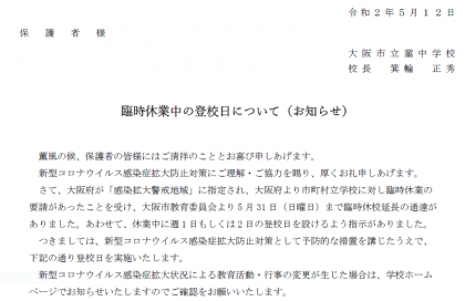 平素は本校の教育活動にご理解賜り誠に有難うございます。