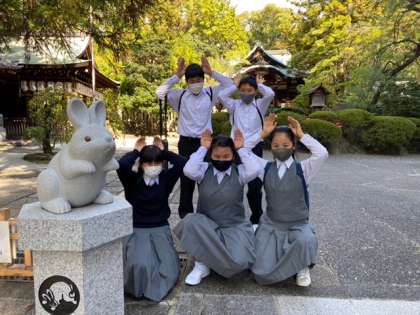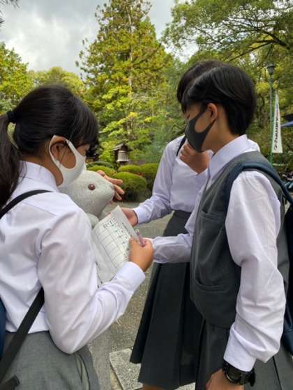 13時半ごろから最後のチェックポイント巡りを終えた生徒たちがロームシアター前に戻ってきました。意欲的な班は、あまった時間を利用して追加のチェックポイントに挑戦していたようです。14時過ぎに無事すべてのクラスの班が集合、平安神宮前での学級写真撮影、バスへ乗車、中学校へ向けて出発しました。