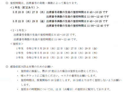5月12日に掲載しました、「1年生、臨時休業中の登校時間について(訂正)」において、『5月22日(水)』と表記しておりますが、正しくは『5月22日(金)』です。