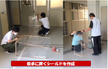子どもたちが下校したあとは、1年生の職員で教室等の消毒をおこない、すでに3年生が使用している教卓用のシールドを管理作業員さんの指導のもと制作しました。