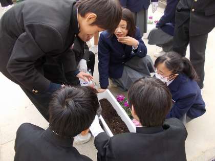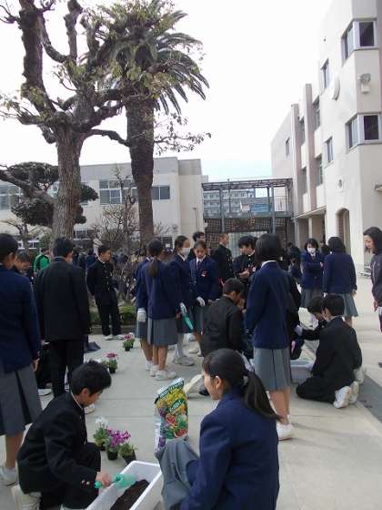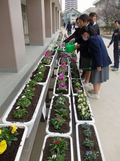 1月21日(水)、1年生全員でプランターにさまざまな花を植え付ける「ふれあい花植え」作業を行いました。この取り組みは、環境緑化推進はもちろん、植物愛護、学校の備品を大切にする意識を醸成することなどを目的としています。