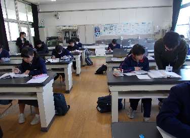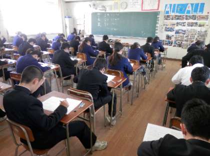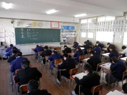 3年生にとって、学年最後のテストが今日から始まりました。今日は、国語・社会・音楽のテストでした。熱気を感じるほどの集中力でした。明日は、数学、技術家庭、英語が行われます。 -
