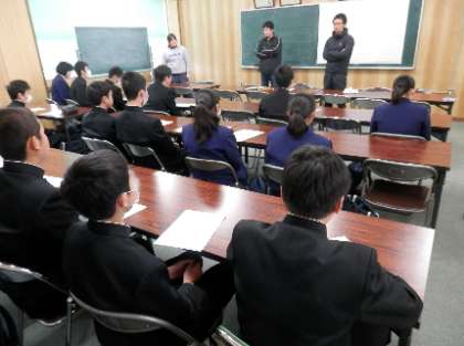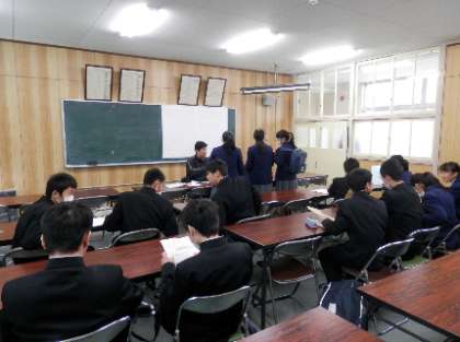 本日も全校集会は中止。インフルエンザが猛威をふるっています。1年6組では、発熱等による欠席者数が10人に達し、うちインフルエンザが6名のため、1限終了後早退の措置をとりました。明日から2日間、学級休業とします。外出を控え、体調管理に努めてください。 -