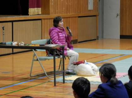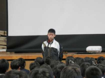 午後2時から小中交流会として、校区三小学校(関目・関目東・すみれ小学校)の6年生が本校に来てくれました。生徒会の司会進行のもと、体育館でパワーポイントを使った中学校側の学校説明や各小学校の児童会代表から各小学校の取り組みの様子などについて発表しました。