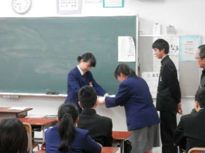 雨の影響で、全校集会が中止になりましたが、本日は、在校生から3年生に卒業記念品を贈る日でした。2年生の各学級の代表が、それぞれ同じクラスの3年生に自分たちで作成した卒業記念品を贈呈するために各教室を訪問しました。各学級では、2年生から3年生に「お世話になった感謝の気持ち」を込めてあいさつし、3年生の学級代表に記念品を手渡しました。3年生の教室からは温かい拍手が響いていました。 -