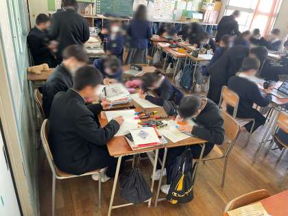 本日6限目は卒業記念品制作の3回目になります。これまでコルクへの色塗りや色鉛筆を使って下書きなどしてきましたが、やっと完成がみえてきました。1つ完成し、2つ目を制作してくれている人もいます。がんばれ76期生!!