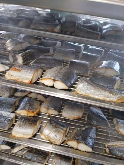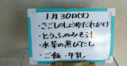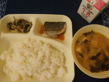 本日の給食のメニューは、さごしのしょうゆだれかけ、とうふのみそ汁、水菜の煮びたし、ごはん、牛乳でした。