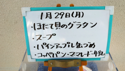 本日の給食のメニューは、ほたて貝のグラタン、スープ、パインアップル(カット缶)、コッペパン、マーマレード、牛乳でした。