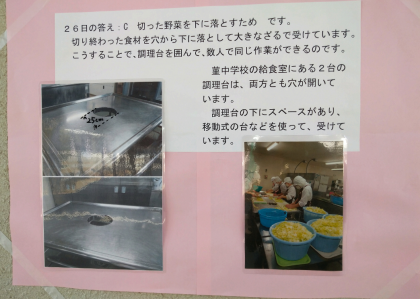 今日は、1つ問題を提供いたします。給食調理委員のみなさんは、朝何時に来られているでしょうか?ヒントは、写真の中に…。