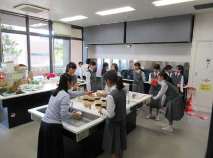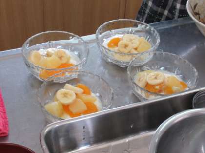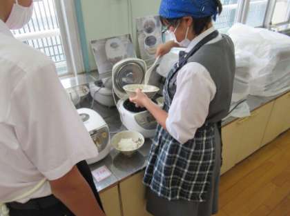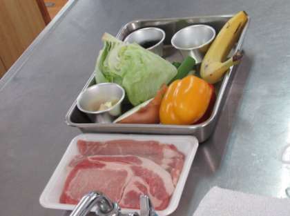 今日から2年生の調理実習が始まりました。メニューは、豚肉の生姜焼丼、お吸い物、野菜サラダ、フルーツヨーグルトでした。今日は、学習支援ボランティアの方もお一人参加してくださいました。 -