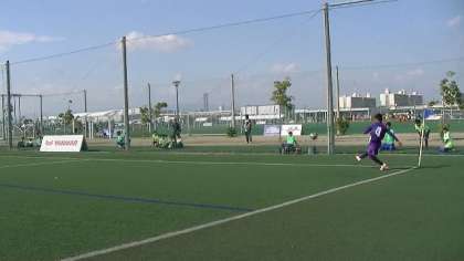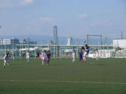 J-green堺の会場で大阪中学校秋季サッカー大会ベスト8を掛けた試合が行われました。本校は、高槻の阿武山中学校と対戦。素晴らしい会場で試合をすることができましたが、強風が吹く中、ボールコントロールが難しい試合となりました。前半、1点を先攻されましたが、終了間際に1点を返し、同点で後半戦へ。 -