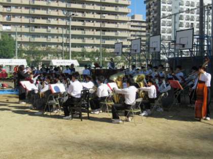 本校の吹奏楽部が、開会のオープニングイベントで演奏を行いました。日頃、応援していただいている地域の方々に感謝の気持ちを込めて演奏しました。小学校の児童向けの曲を含めて全部で3曲と開会のファンファーレも演奏しました。 -