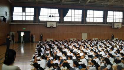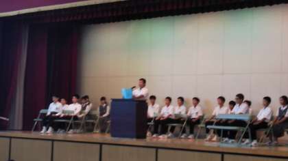 本日は、定例の1年生の学年集会を行いました。集合状態は、先週に比べ少し改善されました。しかしながら、学級委員長の「かけ声」に耳を傾ける心が欲しいものです。その姿勢が、更に集合状態を良くすることに繋がります!