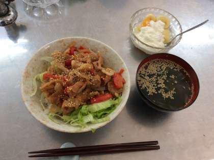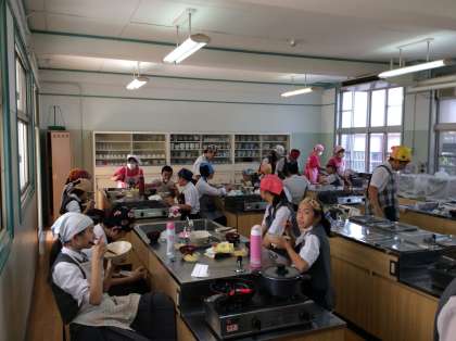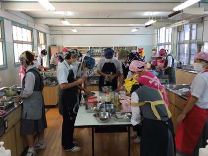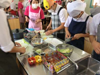 本日から第2回調理実習がスタートしました。メニューは『豚肉の生姜焼きと野菜のっけ丼、わかめスープ、フルーツヨーグルト』です。1回目の鮭のムニエルも人気のメニューですが、今回もしょうが焼きのつけダレでご飯が進むメニューです。前回より生活改善推進員協議会の方々に今回も来ていただいて食材の準備から格種のサポートまでお世話になっています。本当にありがとうございます。たくさんの材料をてきぱき切って調理し、どの班も4班終了のチャイムまでに片付けを終えることができました。大きな成長が見られました。