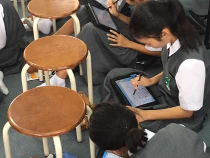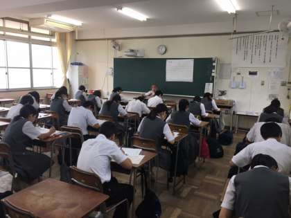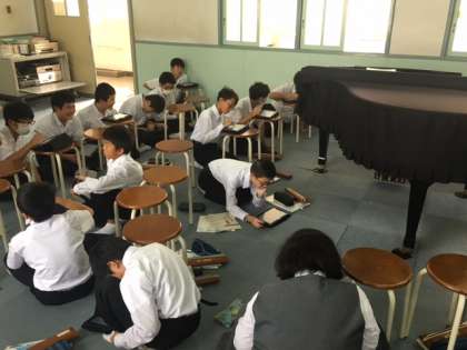 4限目の授業風景です。歌曲を聴きイメージを膨らませ、自分の感想とそう感じた理由をタブレット端末に書いてゆきます。次に他の生徒と意見を交流させる授業をおこなっています。夢中になって書く子や、たくさん書く子がいました。1年生はすでに小学生のころからタブレット端末を使うことに慣れており、ICTを使った授業がスムーズに行えます。早く一人1台持てる時代になって欲しいですね。