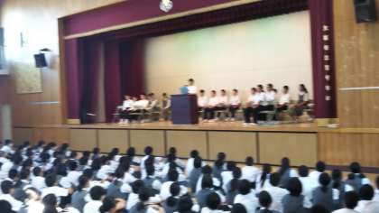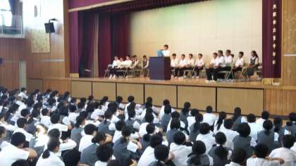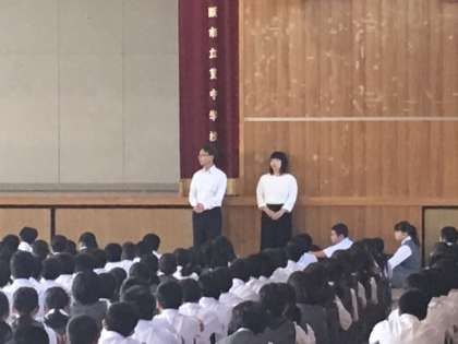 はじめにクラブ表彰がありました。大阪市総合文化祭に出展した技術家庭科、美術科の作品、続いて剣道部、陸上部が表彰されました。おめでとうございます!続いて、さざなみ学級に着任された先生の紹介がありました。西谷先生、よろしくお願いします!