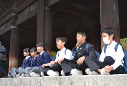 1年生が、秋の校外学習に出かけました。今回は、京都市内の文化遺産を巡る班別行動を行いました。岡崎公園を出発し、事前に立てた散策コースを各班の目標を守りながら、時間内に移動し岡崎公園に戻ってくる班別の行動となりました。途中、歴史的な文化建築物に感動する姿や笑顔がたくさん見られ、紅葉に色づく山々も身近に感じることができました。今回の学習成果を来年度の遠足に活かすことができたらと考えています。 -