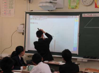 1年生の数学では、コンパスを使って75度の角度を作図する方法について、いろいろなパターンについて班別に協議し求め方を報告しました。