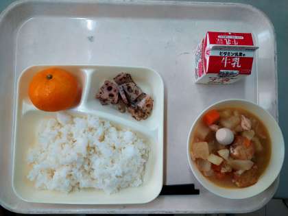 本日の給食のメニューは、関東煮、れんこんの赤じそあえ、みかん、ごはん、牛乳でした。