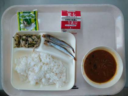 本日の給食のメニューは、焼きししゃも、さといもの和風カレー汁、ささみと小松菜のいためもの、まっ茶大豆、ごはん、牛乳でした。