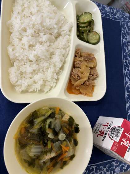 本日のメニューは、豚肉のコチジャンいため 鶏肉とはるさめのスープ、きゅうりのナムル、ごはん、牛乳でした。