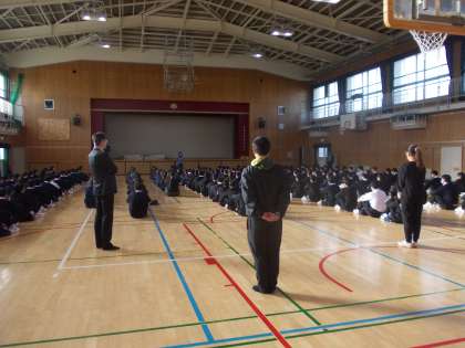 2年生は明日の校外学習の事前指導が体育館で一斉に行われました。忘れ物なく、ルール・マナーを守って校外学習を成功させてください!明日は、忘れ物がないように…また遅刻がないように…、欠席の時は、8時20分までに学校へ連絡をお願いいたします。