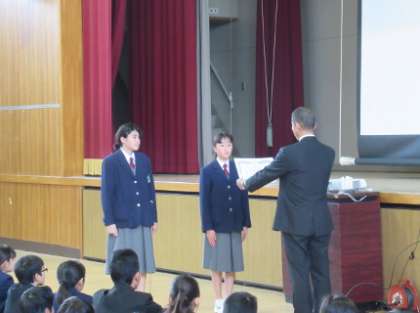 また、今日は、表彰伝達も行いました。読書感想文を出展し、大阪市図書館協議会賞を3名が受賞しました。部活動では、剣道部の女子がこの土日に行われた宮川旗争奪錬成大会に出場し、団体で3位になりました。 -