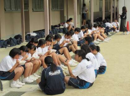 各部活動ごとに集まって、おにぎりと豚汁を美味しそうに食べていました。
