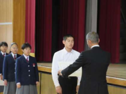 全校集会を行いました。本日も遅れていた表彰状の授与を行いました。今回は、総合文化祭に出展した技術、家庭科の部でいただいたものと、茶道部のお点前披露でいただいた賞状、剣道部が宮川旗争奪戦の団体の部でいただいた第3位の表彰状をそれぞれの代表に渡しました。 -