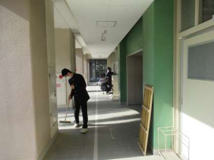 3年生では、午後から進路懇談会を行っています。1,2年生では、6限終了後、清掃の最後に教室の油引きを行いました。各教室では机やいすをすべて廊下に出しての作業となりました。美化委員が最後まで残って頑張っていました。 -