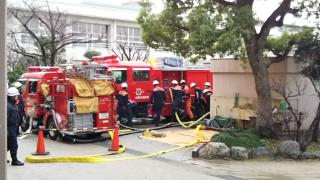午後から本校のプールを使って、城東消防署の放水訓練が行われました。大震災等が発生し、大量の放水が必要となった時に普段は使用しない大型ホースを使用しての放水訓練を行っていました。普段は使用しないホースということもあってか、なんだか大変そうでした。 -