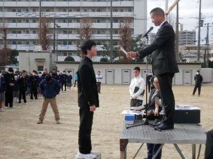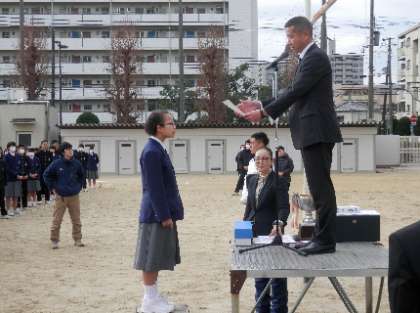 ラグビーでは、本校が大会会場となり、平成28年度 大阪市北地区新人戦大会が行われました。本校のラグビー部は、決勝戦で緑中学校と対戦。目標としていた「優勝」を見事に勝ち得ました。今日は、3年生もサポート役をしてくれました。いつもながら、本日もたくさんのOBの方や保護者の方の声援をいただきました。本当に心強く思います。