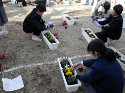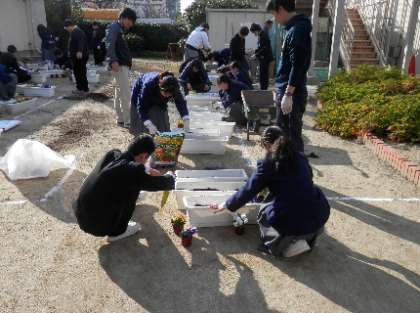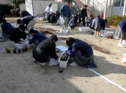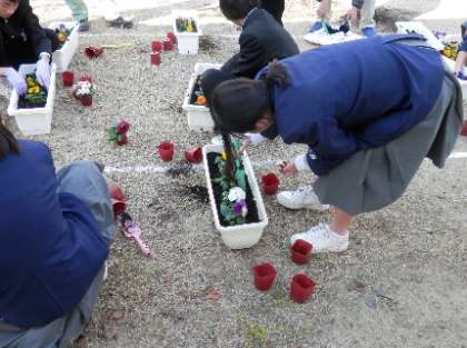 本日放課後、文化委員会のメンバーがパンジーのポットをプランターへ移植しました。これからしばらくの間、職員室前で育てられ、見頃になる頃に卒業式や入学式を飾ります。各学級2名でプランター3ケース(ポット12個)の植え替えをしました。大きなミミズにビックリする生徒もいましたが、みんなていねいに土を敷き詰め、やさしくポットから取り出し、プランターに植え込んでいました。「土に触れる」なんとなく心休まる一時でした。