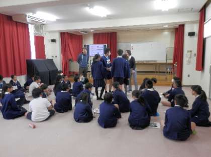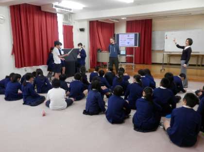 昨日に続いて、本校の英語教諭がすみれ小学校へ出前授業に行きました。英語でのあいさつを行った後、各自で3ヒントクイズをつくり、2ペアになって問題を出し合ったり、4人組になって出題したりしました。 -