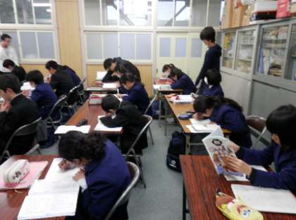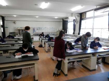 1.2年生の学年末テストが22日(水)から始まります。そのテストに向けて2年生の希望生徒を対象にテスト前学習会が行われました。大学生の学習ボランティア3名が参加し、24名の生徒を対象に午後5時30分まで自主学習会が行われました。 -