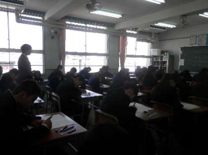 本日から3日間、1.2年生の学年末テストが始まりました。今日は、国語・社会・音楽のテストでした。明日は、数学・英語・技術家庭のテストを行います。 -
