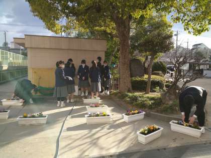 1,2年生が、卒業式並びに入学式用のプランターにお花を植え替える作業をします。