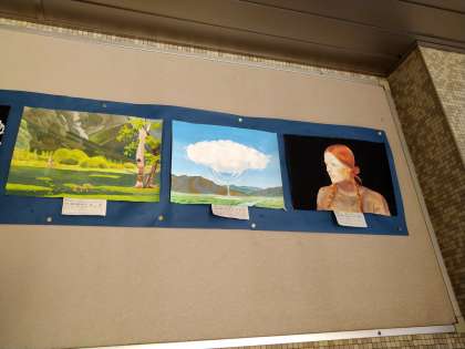 正面玄関スペースには、3年生の美術の絵画作品や風紀委員ポスターをはじめ、たくさんの情報が掲示されています。