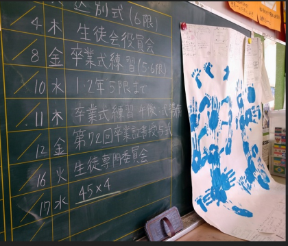 教室の黒板には、送別式や卒業式の文字も見られるようになりました。
