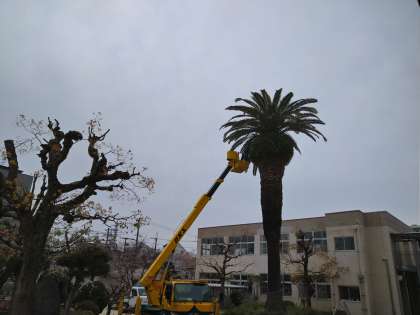 本校中庭は、緑が多く自然豊かな学校であります。今は、桜もきれいに咲いております。とても大きなフェニックスの木もあり、長く菫の歴史を見守ってくれております。今日は、フェニックスの剪定をしていただきました。ありがとうございます。