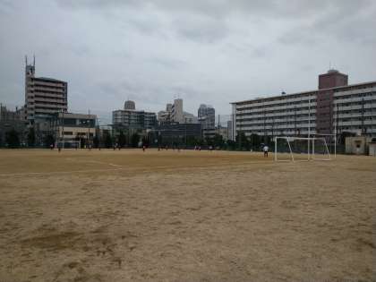 グラウンドでは、サッカー部が練習を行っています。とても鮮やかなユニフォームの選手たちがフィールドを走りまわっております。 -