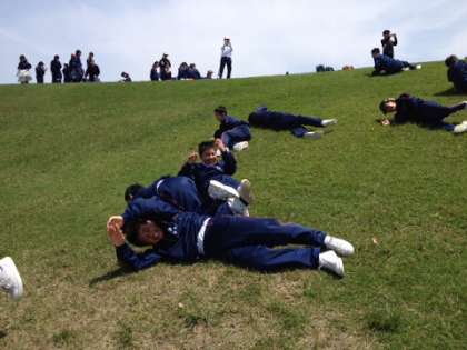 芝生広場で学級ごとに昼食を食べた後、あまりにの気持ちよさで、斜面を転がってしましました。その後、入所式を行いました。入所式では、生徒代表から施設の方にあいさつを行いました。