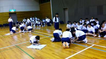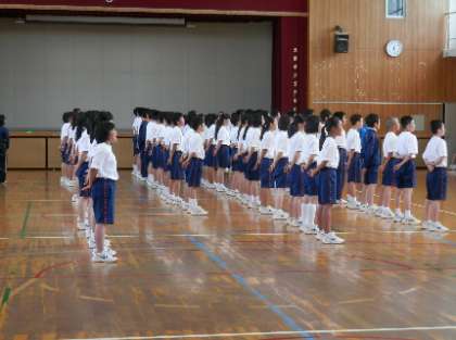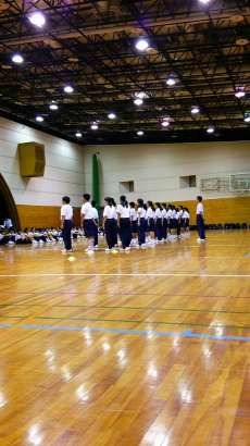 修学旅行や一泊移住、校外学習が終わり、次は体育大会です。今、体育の授業では、体育大会に向けての練習が始まっています。今日は、昨夜の雨の影響でグランド状況が悪かったこともあり、体育館で練習しました。2年生の練習風景です。行進の練習や準備体操、隊形移動など細かく練習していました。体操もしっかり腕が伸びています。↓ -