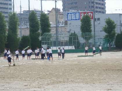 各学級の体育委員が早朝より体育大会に向けてグランド整備をしてくれています。午後に行う全体練習に向けて、ライン引きも行いました。体育大会を成功させるための大きな存在です。 -