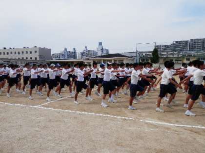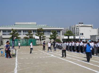 体育大会に向けて、1回目の全体練習を行いました。本日は、入場行進→開会式→ラジオ体操第二→学級生徒席の確認→閉会式について練習をしました。しっかり足を上げています↓